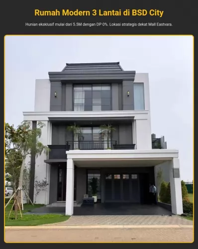 Temukan rumah 3 lantai mewah di Cluster BSD City mulai dari 5.5M. Nikmati fasilitas premium seperti private lift, smart home system, dan taman hijau. DP 0%!